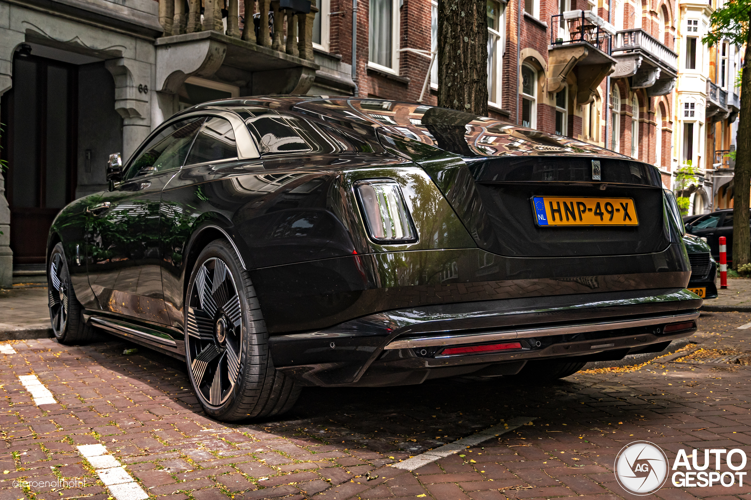 Persoonlijke primeur! First for me. Zo zie je ze nooit en zo zie je er twee op dezelfde dag. Ik vind het een ontzettend chique model en vooral in deze groene kleur, die helaas onder dit dak van bladeren niet helemaal tot z'n recht komt. Dit exemplaar, dat bijna twee maanden op kenteken staat, kostte de eigenaar €511.619 met een bpm van slechts €666.